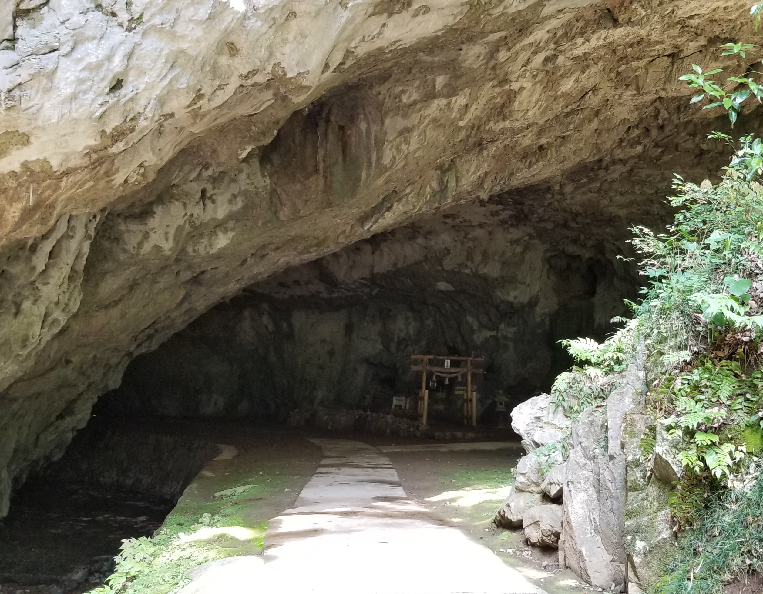 まそれでも十分なほどなんですけどね。なんてったって、巨大空間。一見しょぼそうなのに、想像つかないほどでかいのです。巨大1枚岩の下に神社に車道?と思うほどの道。しかも奥がまたドカーンと広くて、全行程完全バリアフリー、車いすで行って帰って来られるのです。石垣で護岸された川沿いのコンクリートの道を歩くんで、興もそがれるかと思いきや、大正洞とは全然違う、日本でも指折りの空間の巨大さが、それを許してくれちゃうのです。こんな巨大洞窟に、ぼくのほかにはカップルが一組だけ。ほぼ独り占めみたいなもんです。